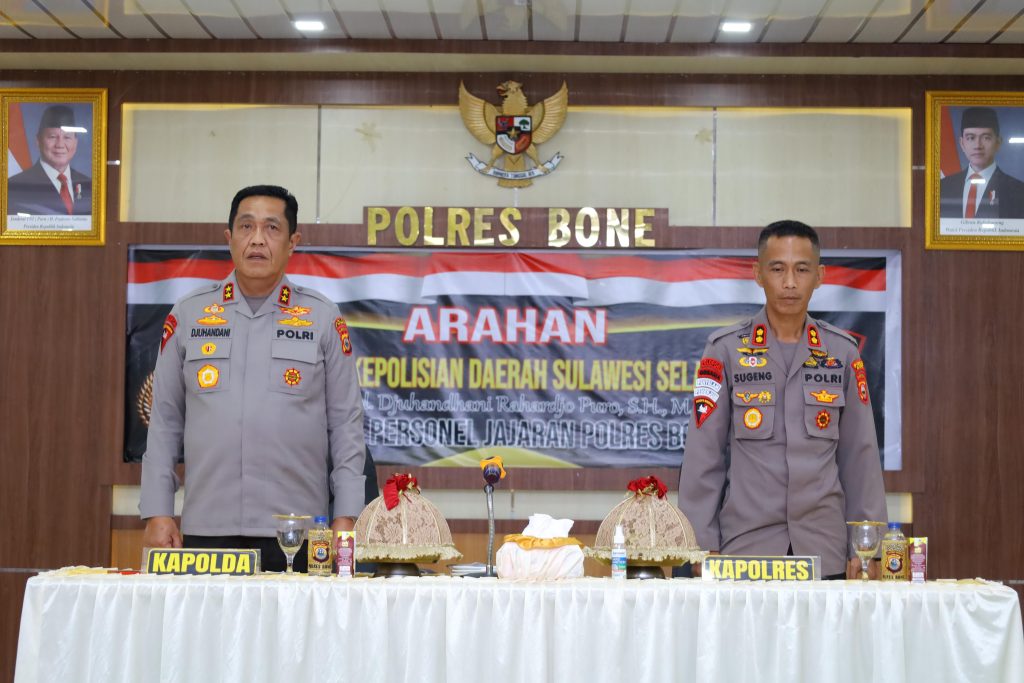 Masambanews, Bone – – – Kapolda Sulawesi Selatan Irjen Pol. Djuhandhani Rahardjo Puro, S.H., M.H., melaksanakan kunjungan kerja ke Polres Bone, Senin (06/04/2026). Kunjungan tersebut bertujuan untuk memberikan arahan serta penguatan kepada seluruh personel dalam pelaksanaan tugas kepolisian di wilayah hukum Polres Bone.